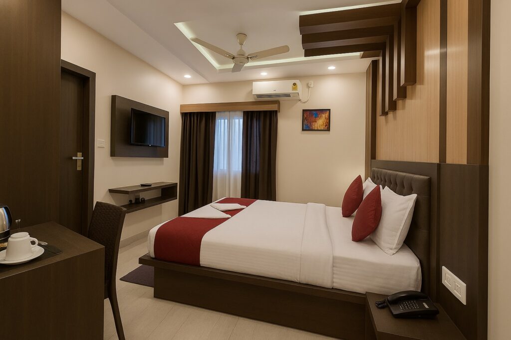 Premium Rooms at Hotel Bay Walk are spacious, air-conditioned, and designed for up to 3 adults + 1 child. Each room includes a king-size bed, complimentary breakfast, LED TV with satellite channels, and 24/7 hot & cold water.